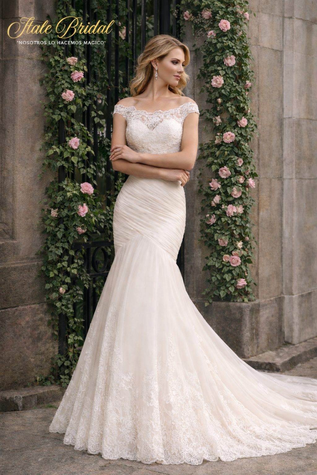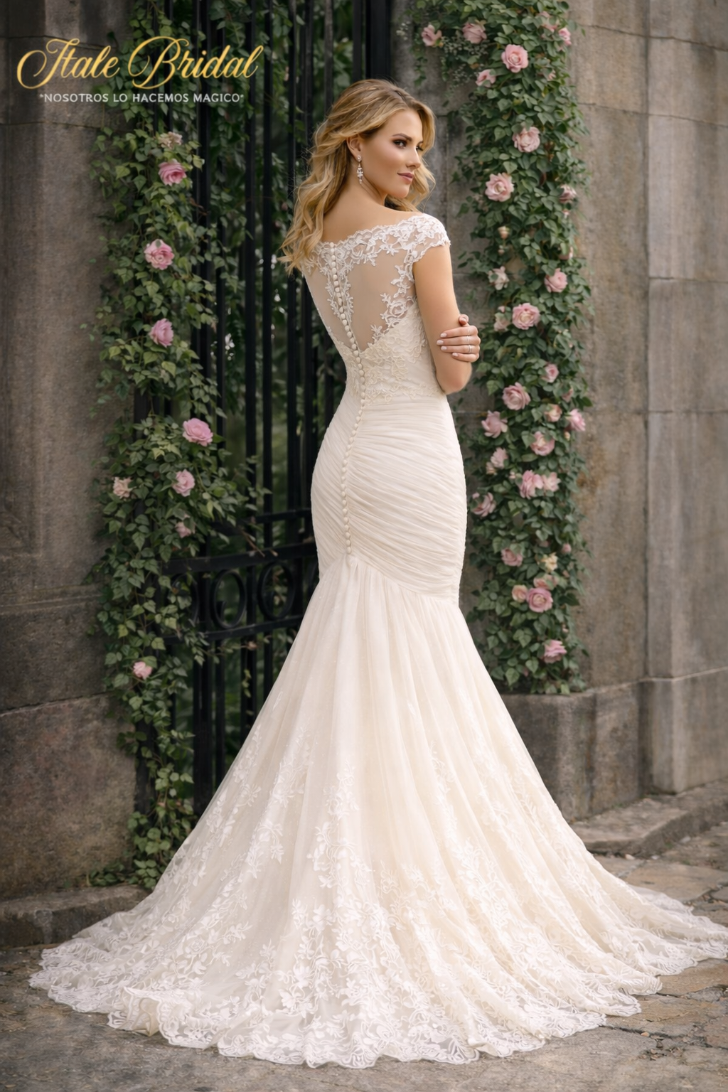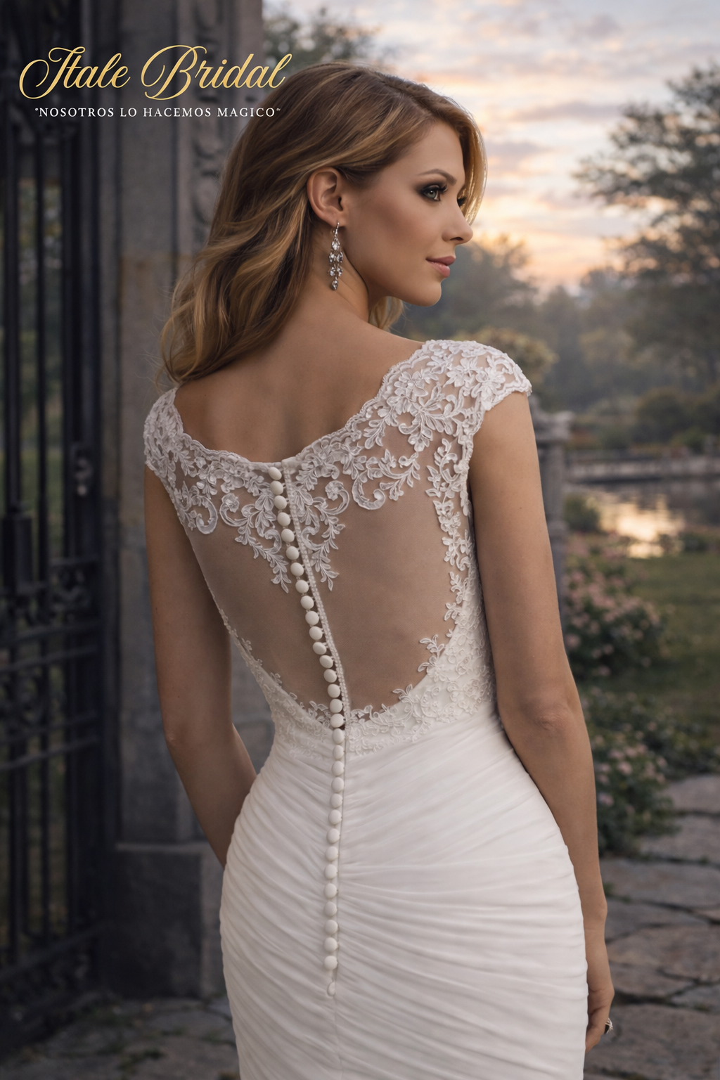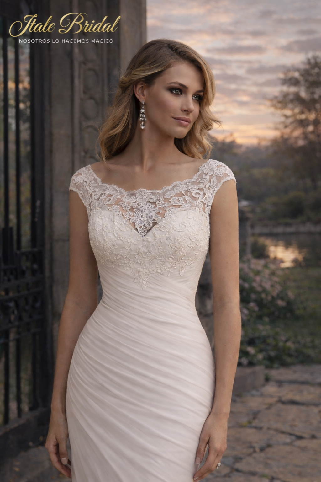La suave malla drapeada y el delicado encaje Alencon se combinan a la perfección para crear este vestido de novia romántico y acampanado. El encaje festoneado de Alencon recorta el escote tipo barco y la hermosa ilusión hacia atrás. Un dobladillo festoneado remata el look.