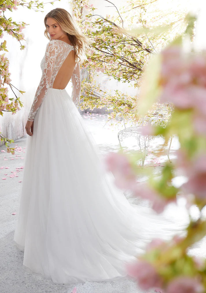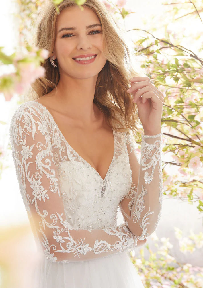 Perfecto para una boda de destino, este vestido de novia de manga larga con red inglesa presenta una blusa con cuello de pico bordada y con cuentas de cristal. Un impresionante ojo de cerradura de nuevo completa el aspecto.