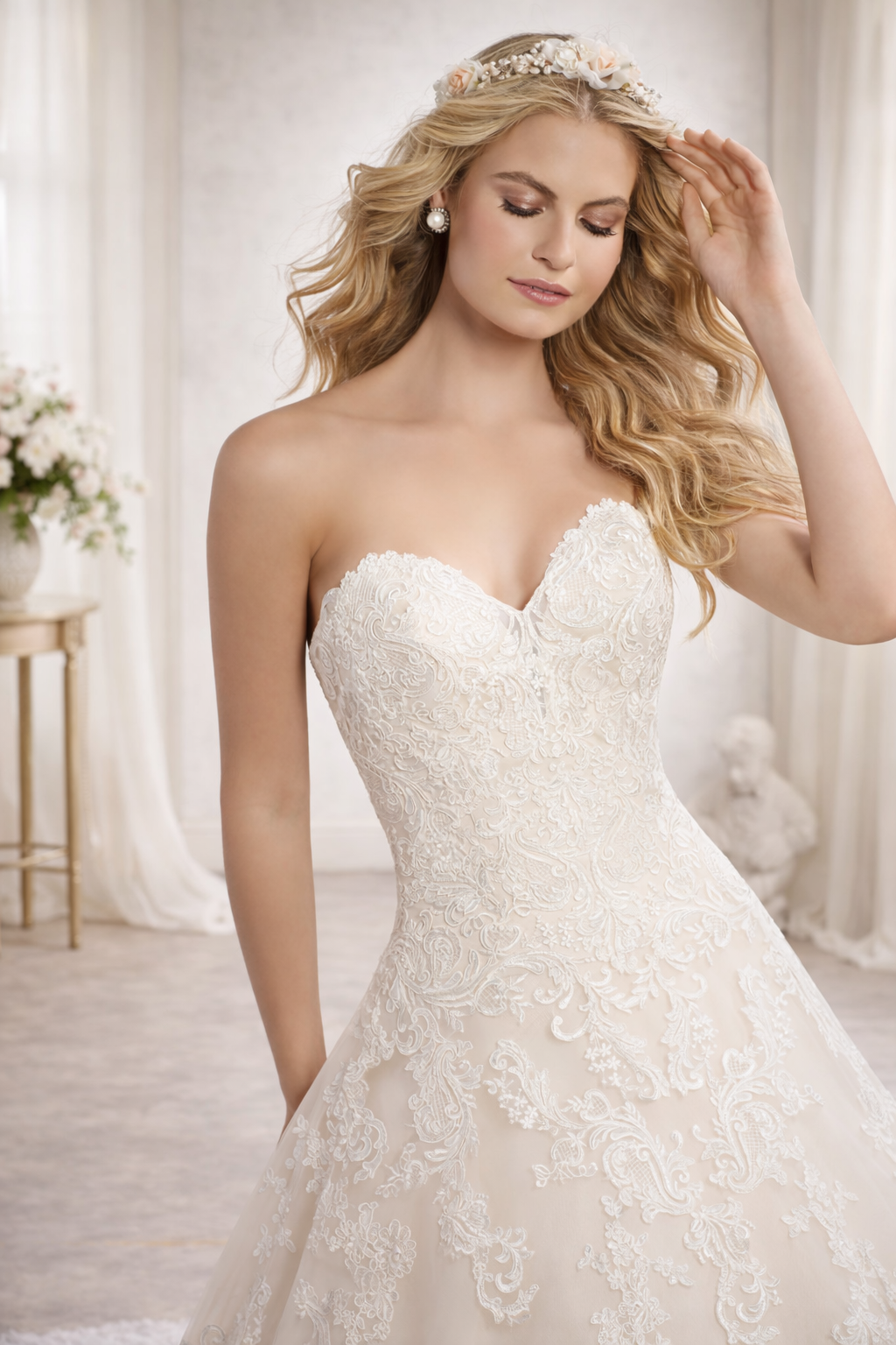Los apliques de encaje Alençon acentúan este clásico vestido de novia. Con un escote corazón, sin tirantes y una falda de tul con un amplio dobladillo festoneado. Detalle de botones cubiertos a lo largo de la espalda.