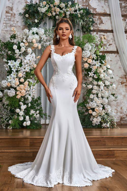 Este vestido de novia es puro impacto. Diseñado para robar miradas, su silueta sirena abraza el cuerpo con precisión, resaltando las curvas de manera elegante y poderosa. El escote estructurado con tirantes bordados aporta carácter y sofisticación, mientras que los delicados apliques florales recorren el cuerpo creando un efecto visual simplemente espectacular.