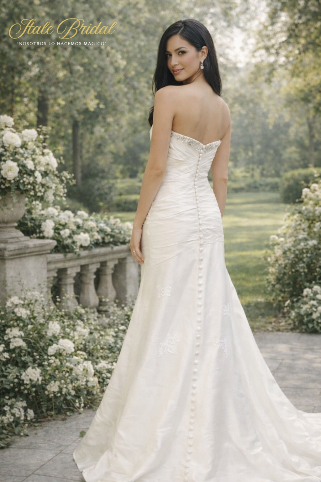 El vestido de novia está hecho de la fina seda shantung. Tiene un corpiño en strappe y drapeado en minimalista, es la parte de la espalda tiene un bordado de pedreria.