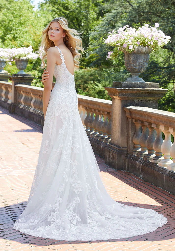 Este vestido de novia de silueta línea A estilizada deslumbra por la delicadeza de sus detalles y su acabado sofisticado. Confeccionado en tul suave bordado con cuentas de cristal transparente, crea un sutil efecto luminoso que realza cada movimiento con un brillo refinado y nada excesivo.