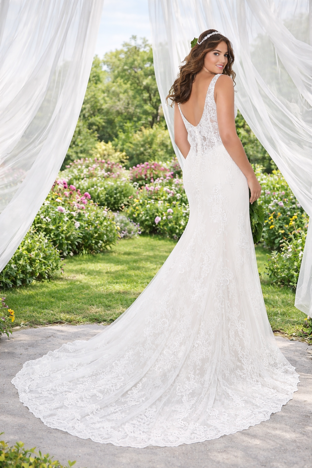 Un vestido de novia que encarna el lujo y la elegancia en cada detalle. Su delicado encaje bordado se fusiona con una silueta que estiliza la figura, creando una presencia sofisticada y atemporal. Los acabados artesanales, las transparencias sutiles y la caída impecable de la falda envuelven a la novia en una sensación de exclusividad y refinamiento.