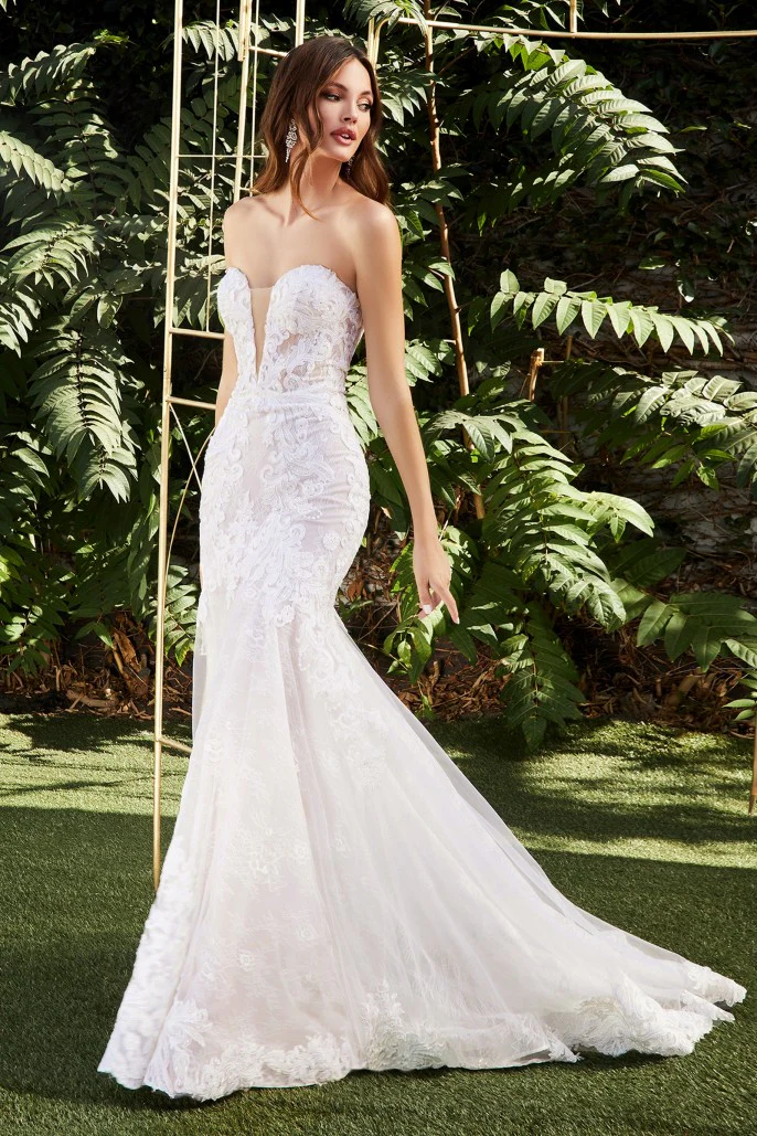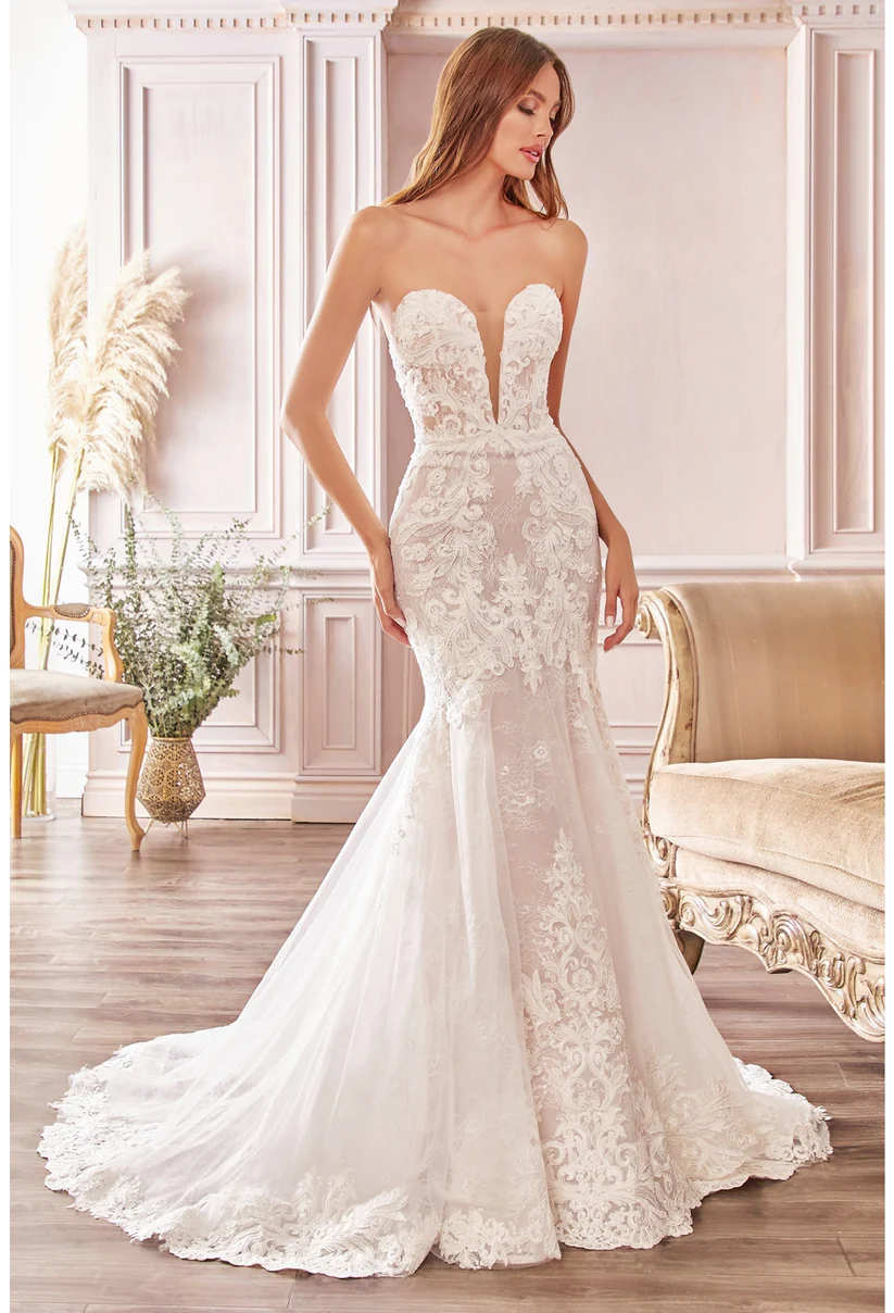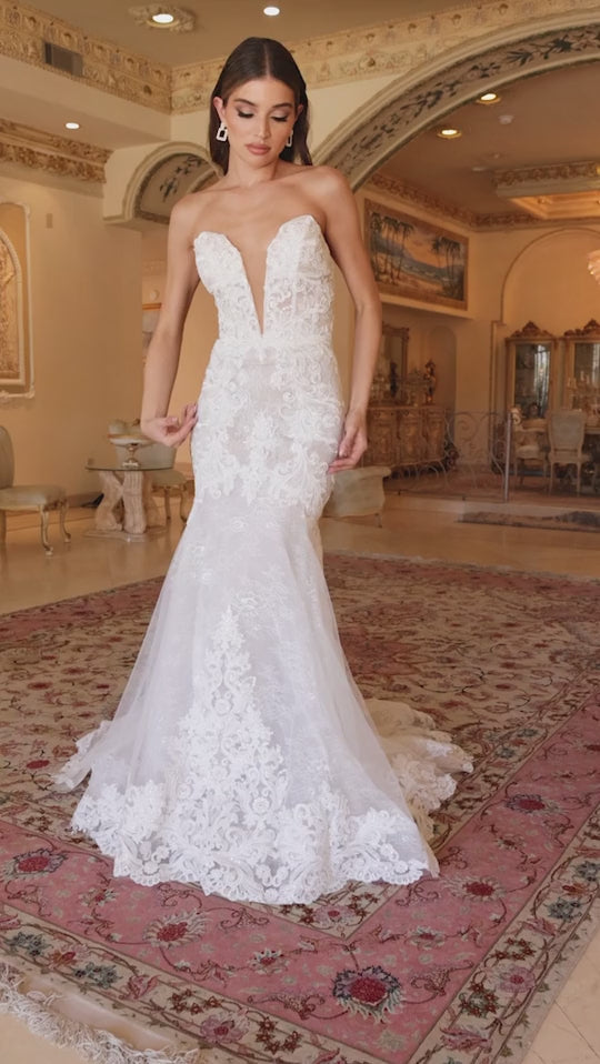 Este vestido es todo lo que sueña una novia, con un hermoso encaje que se centra en la cintura y luego desciende, creando figuras visuales de relojes de arena. La verdadera silueta de sirena se logra con un corpiño tipo corsé y una hermosa extensión de encaje festoneado en el dobladillo. La cola trasera se puede usar larga para la ceremonia y luego acortada con un botón y un lazo discretos. Este es verdaderamente el vestido de novia definitivo que hará llorar de alegría a las novias.